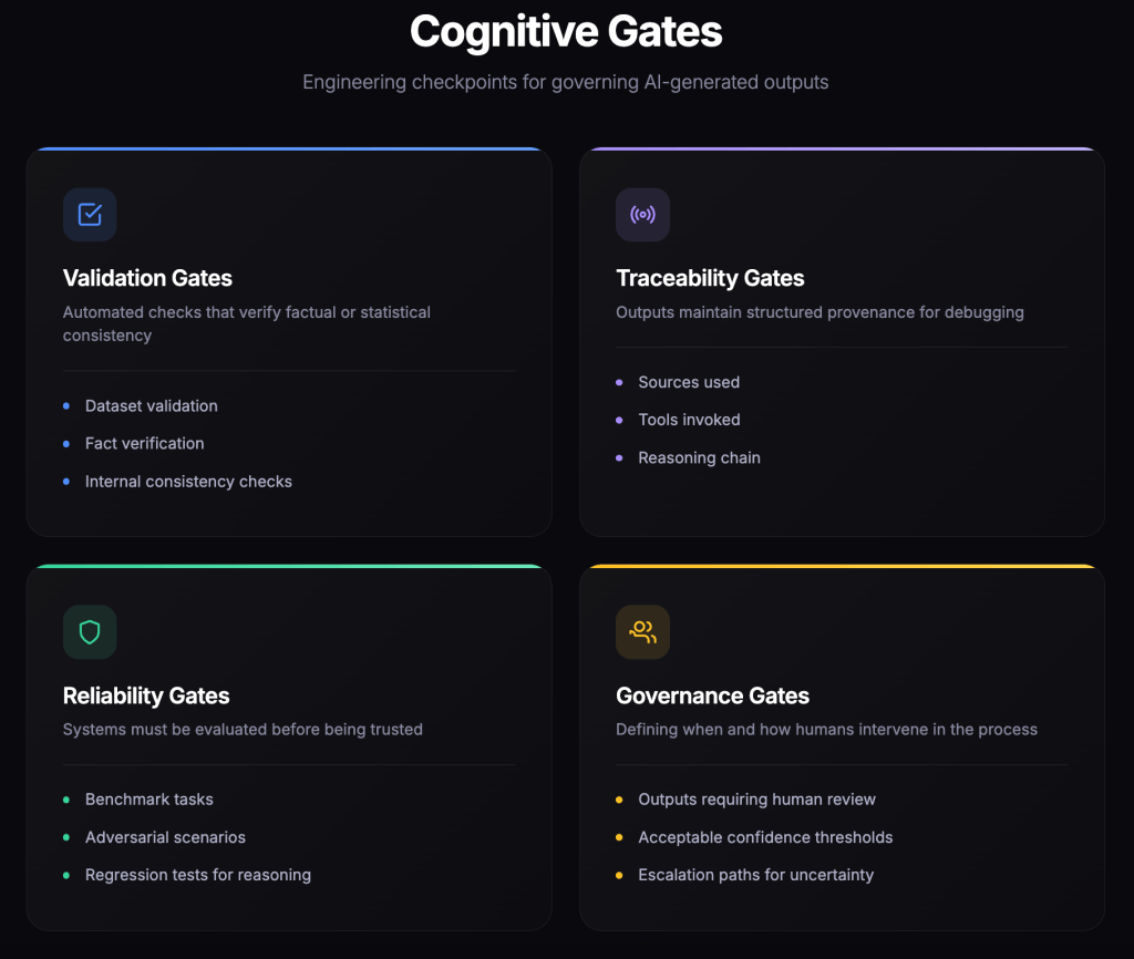 Figure 2. Cognitive Gates. Engineering checkpoints that validate AI-generated outputs through automated validation, traceability of reasoning, reliability testing, and governance mechanisms for human oversight.