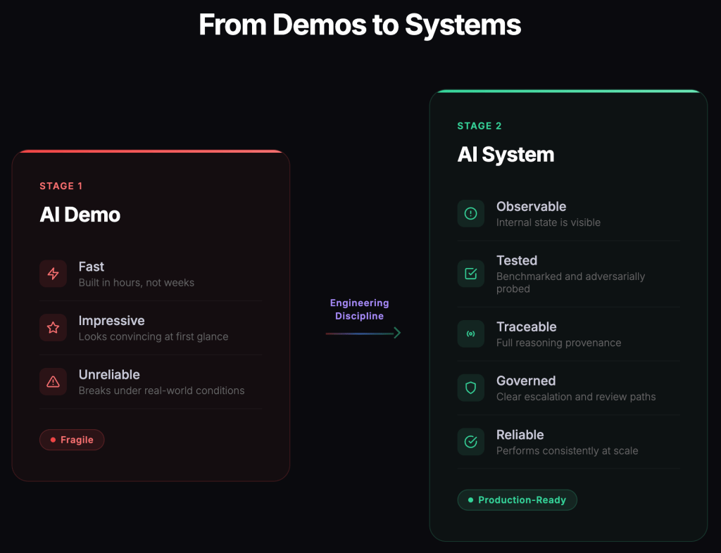 Figure 3. From Demos to Systems. Reliable AI systems require engineering discipline: observability, testing, traceability, governance, and operational robustness.