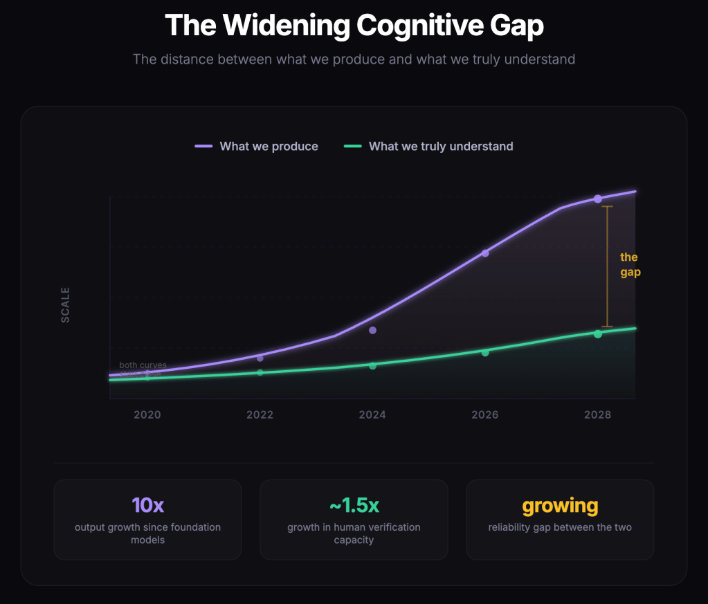 Figure 1. The Widening Cognitive Gap. As the cost of cognitive work approaches zero, the amount of work we produce increases far faster than our ability to verify it. The resulting reliability gap between output and understanding continues to widen.